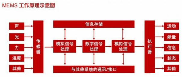 MEMS中的核心元件一般包含兩類:一個傳感器,以及一個信號傳輸單元。傳感器將外界信號轉換為電信號,執行器與外界產生作用,信號傳輸單元能夠對信號進行處理以及與其他微系統連接。MEMS傳感器具有體積小、重量輕、功耗低、可靠性高、靈敏度高、易于集成等優點,正在逐漸取代傳統機械傳感器。