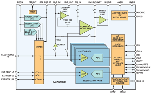 ADAS1000是ADI專門針對監(jiān)控級和診斷級心電圖測量而設計,由5個電極輸入和1個專用右腿驅動(RLD)輸出參考電極構成,旨在簡化采集和確保高質量ECG信號的任務。為了簡化產(chǎn)線測試、開發(fā)以及提供整體上電測試,ADAS1000提供了許多特性。例如,通過校準DAC提供直流和交流測試激勵、循環(huán)冗余校驗(CRC)冗余測試,以及對所有相關寄存器地址空間的回讀功能。輸入結構為差分放大器輸入,允許用戶選擇不同配置方案來實現(xiàn)優(yōu)質應用。