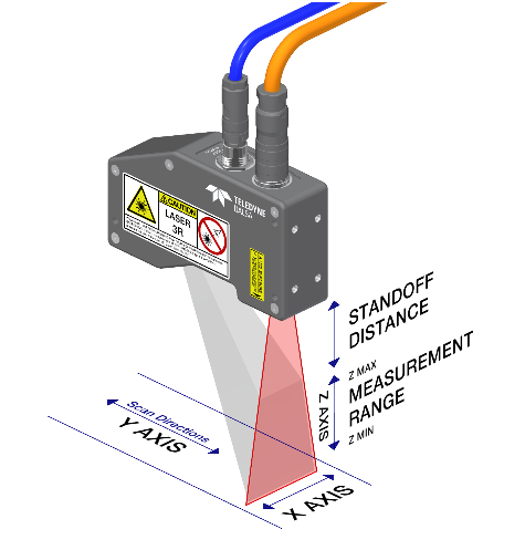 在典型的激光線輪廓儀中,激光線條被投射到物體上,并使用一個2D(區(qū)域/矩陣)圖像傳感器進(jìn)行成像。在確定激光條紋在圖像傳感器上的位置后,輪廓儀會提供由激光條紋的光學(xué)三角測量產(chǎn)生的橫向(X軸)和深度(Z軸)信息。沿著激光線生成的XZ對集稱為輪廓。沿運(yùn)動方向的兩個連續(xù)輪廓之間的距離構(gòu)成第三軸(Y)。通過這種方式掃描物體,我們獲得了物體的表面掃描信息(X,Y,Z)。