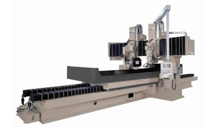 精密龍門磨床主要用砂輪周邊磨削加工大型短寬工件的平面。磨削時工件可直接固定在工作臺面上或電磁吸盤上。龍門磨床采用龍門式布局,包括床身、雙立柱、橫梁組成封閉的剛性框架結構。床身采用雙V型導軌,工作臺導軌面覆有耐磨聚四氟乙烯。拖板沿橫梁導軌作橫向運動,橫向進給由直流電動機驅動,由數控進給。工作臺縱向運動由葉片油泵驅動。可無級調速,采用開式液壓系統,液壓油與導軌潤滑有油溫控制裝置。磨頭可沿拖板垂直導軌做上下移動。垂直進給有快速和自動、手動進給兩種方式。磨頭主軸采用套筒式結構和連接式傳動,主軸軸承為高精度向心推力球軸承。